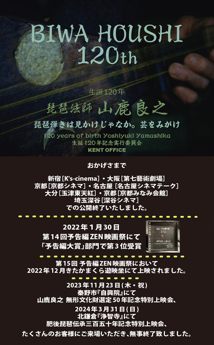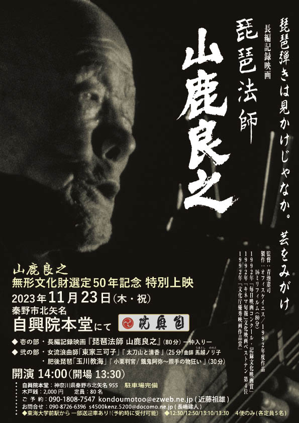 長編記録映画 琵琶法師 山鹿良之 琵琶一本かき鳴らし語り一筋で、大正、昭和、平成を生き抜いた人がいます。 山鹿良之さん、説教節語りの琵琶法師です。1901年(明治34年)生まれですから映画撮影時(1992年)は、91歳。4歳で左眼を失明し、右眼も光を失いつつあり、聴力もおぼつかないのが、今の状態です。毎日飯一合五勺と酒三合を摂り好物の葉は白身魚と明太子とかしわ汁。口跡もとより鮮やか、琵琶を抱けば背筋もキリと伸び、東に竃払い(かまどはらい)あれば行って「般若心経」を唱え、西に演唱会あれば出かけて「小野小町」の一節を語ります。住まいは熊本県玉名郡南関町小原。22歳で肥後琵琶の師に就き、以来70年、琵琶弾きさん《土地の人は親しみをこめてこう呼ぶ)で飯を食いつづけてきました。 山鹿さんの語り物の持ち外題はおよそ40。「小栗判官」や「俊徳丸」のような説教種から「大久保政談一心太助」のような講談ネタまでまさに混淆、「芸人は上手も下手もなかりけり行く先々の水に合わねば」といった趣です。それにしても外題 40種余というのは、語り物のインフォーマントとして圧倒的な伝承量で、仮にその全部を語ったらいったい何百時間になるかという膨大なものです。 この映画は、町の由緒ある芝居小屋、村の古いお宮様、旧家の座敷、そして浅草の演芸場で語り継がれた「小栗」の物語を縦糸に、横糸にはそれを語る山鹿さんの普段の暮らしぶりを織りなして構成されています。山鹿さんは自分の規矩をもって生きる一流の庶民のひとりです。芸の力と日々の過ごし方が混然一体となって醸し出すその魅力、それは、わが隣人、と呼びかけたくなる類の物です。この映画はそんなすばらしい同時代人を記録したものです。